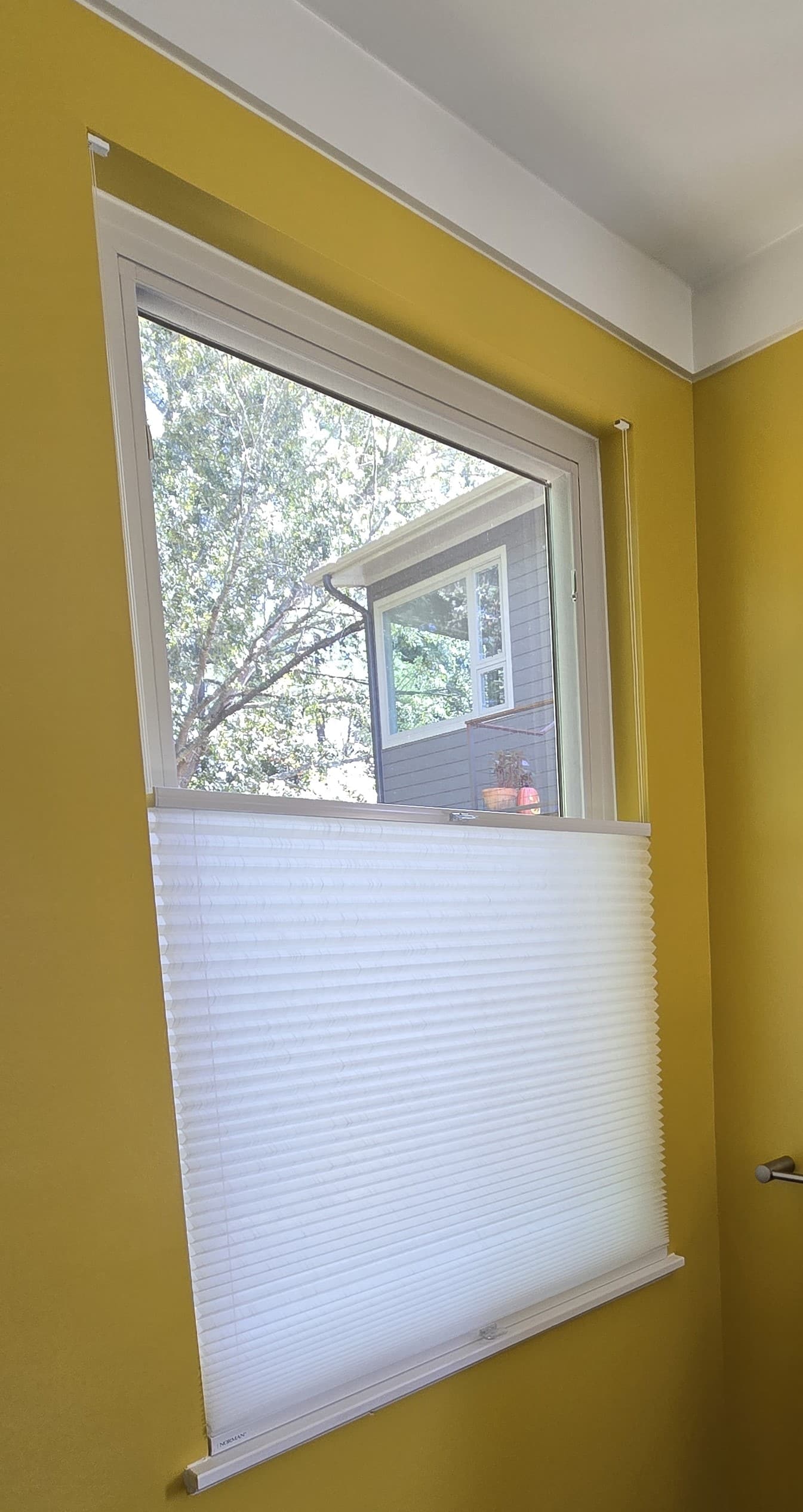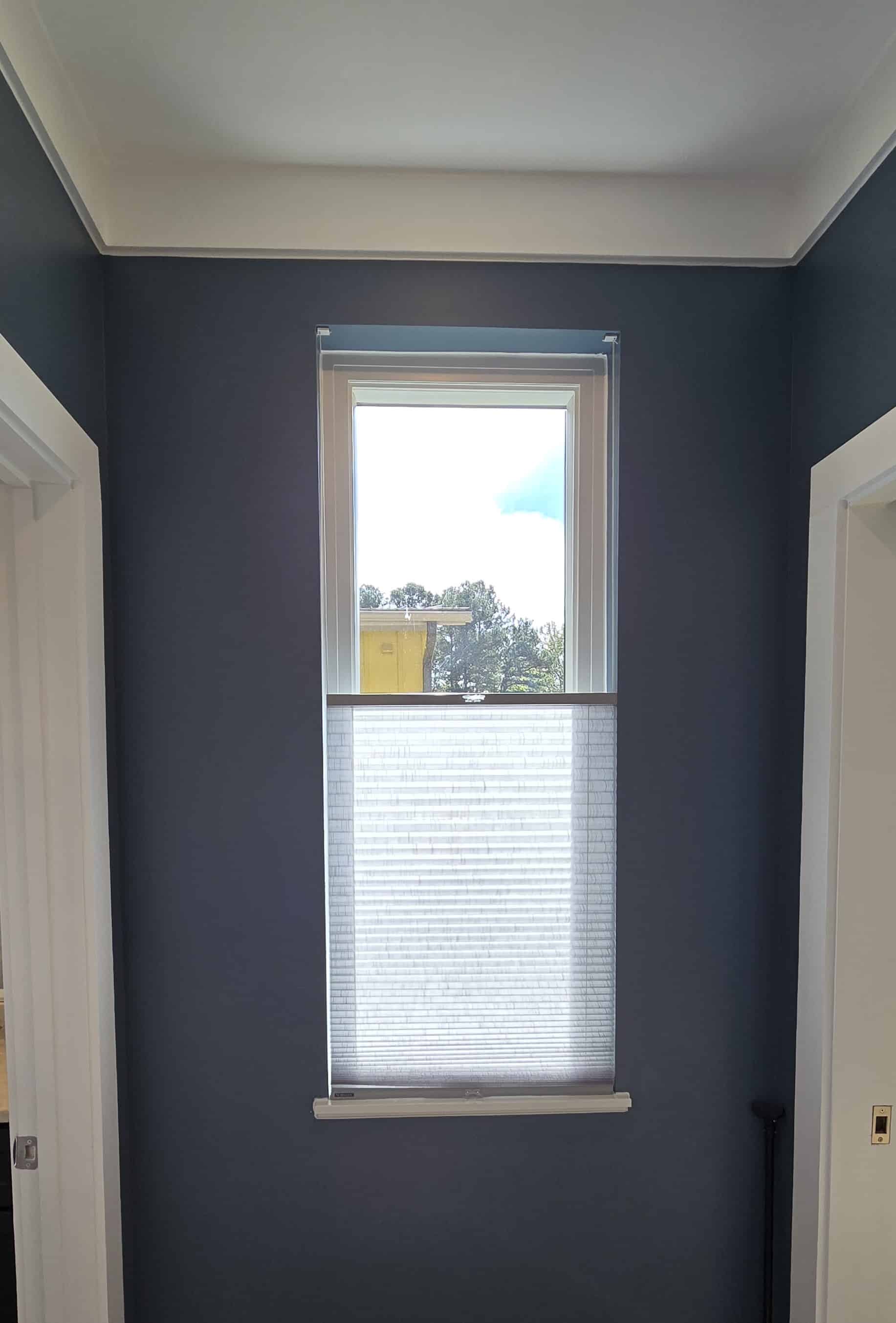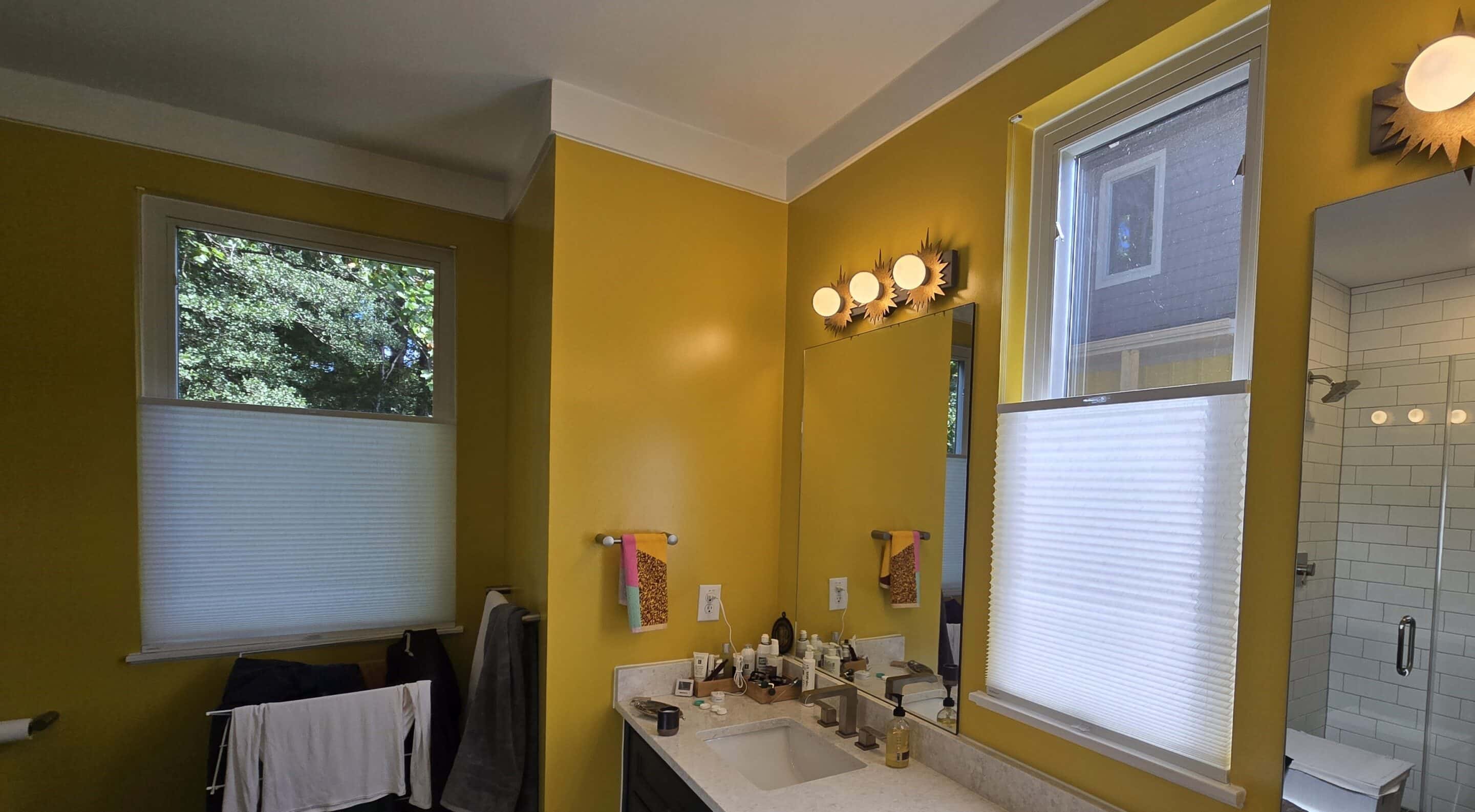 For the bathroom, we installed Norman Window Fashions Top-Down Bottom-Up SmartFit honeycomb shades in a semi-sheer, light-filtering fabric. These shades provide privacy while allowing soft natural light to fill the room. The top-down bottom-up feature offers flexibility in adjusting the amount of light, while the honeycomb design adds texture and enhances energy efficiency, helping regulate the bathroom’s temperature year-round.